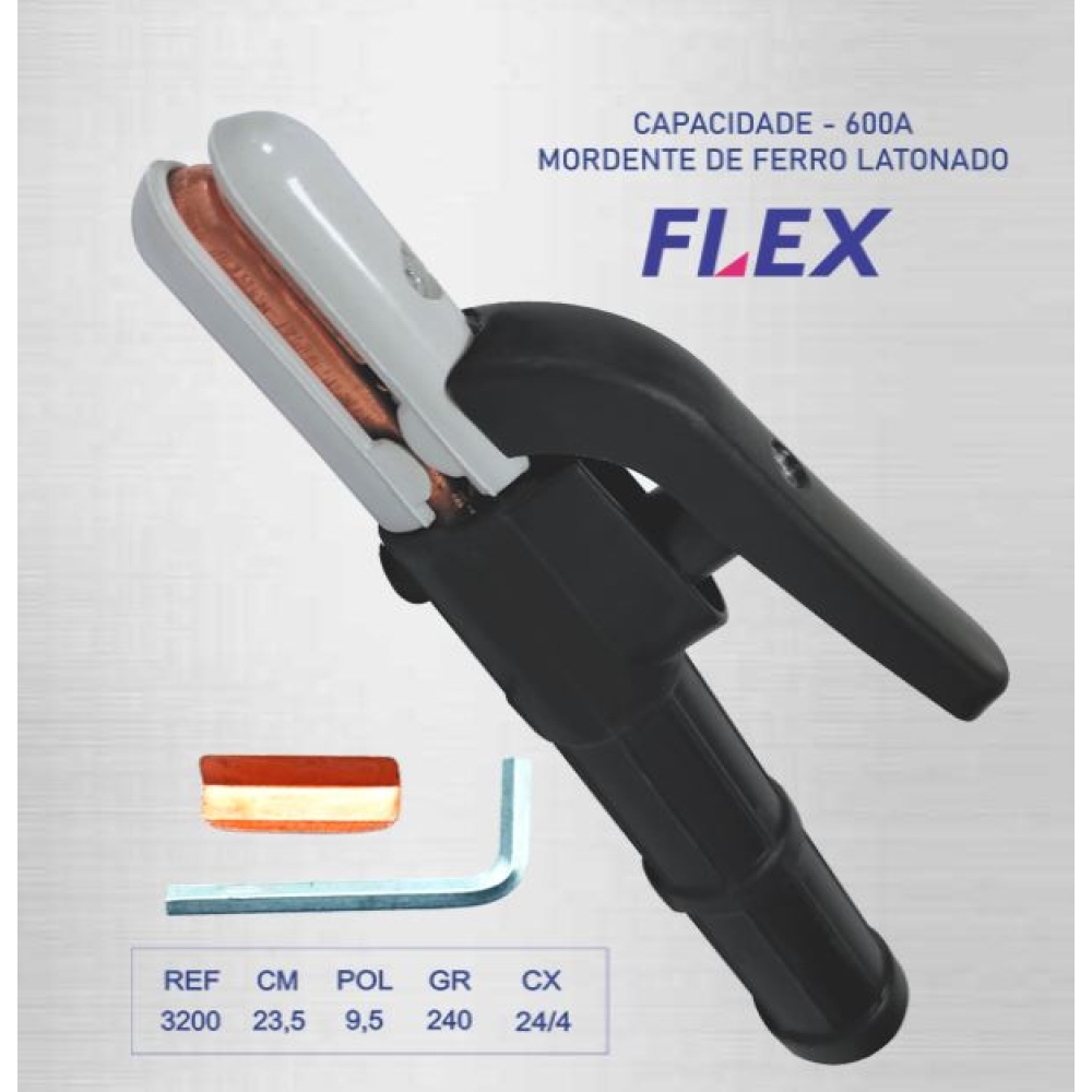 - Alicate porta eletrodo cabo ergonômico de baquelite, mola 100% isolada, alta resistência, capacidade de até 600 Amperes, mandíbula ferro latonado, prende o eletrodo revestido e transfere para ele a corrente de solda.