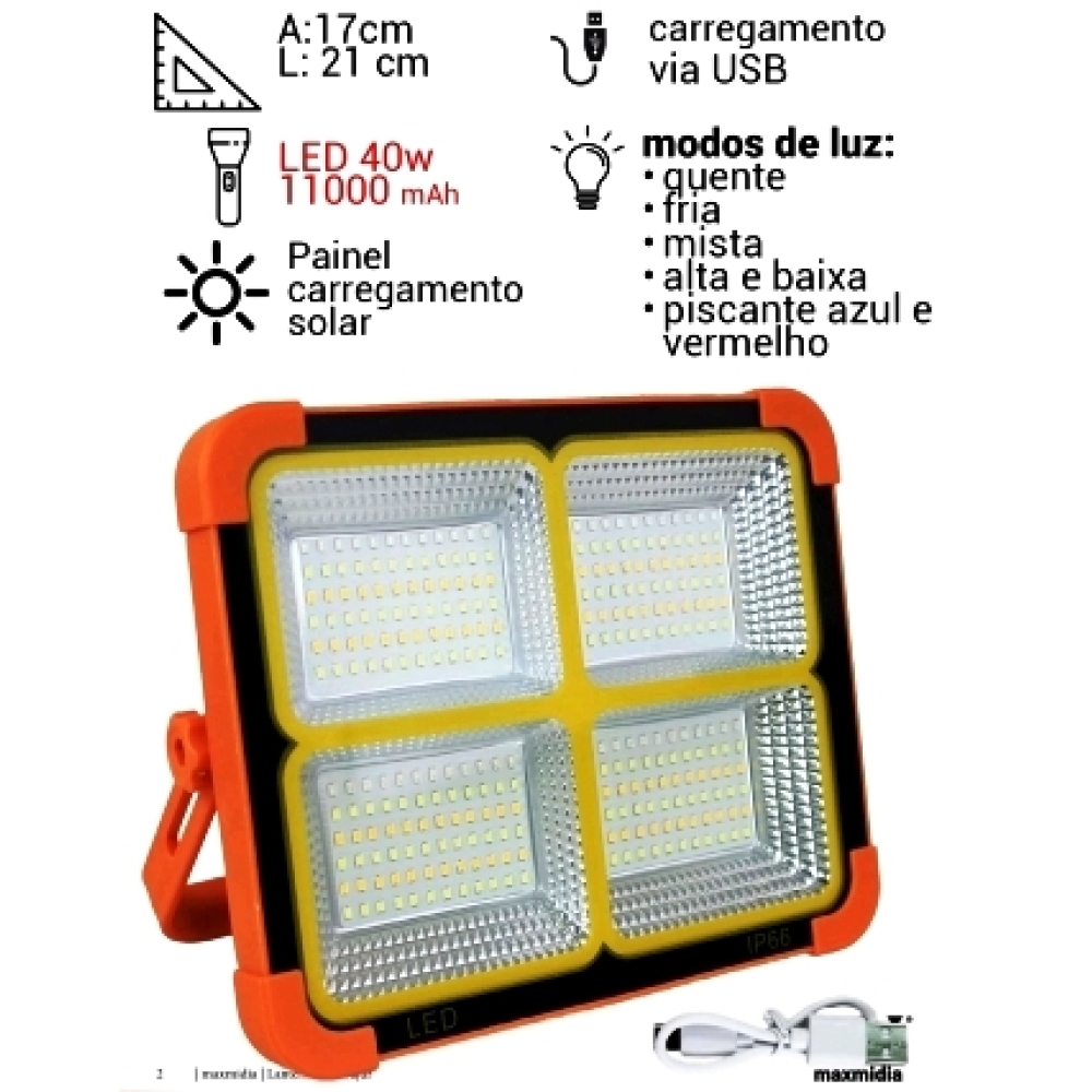 REFLETOR DE LED RECAR. USB E SOLAR 40W